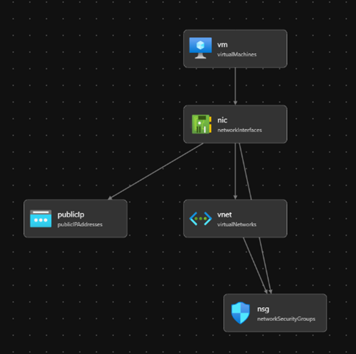 As an example, a virtual machine and its required “additional resources” are provisioned – a VNet with a subnet, a disk, a network card, a network security group and a public IP address. The Bicep template can be accessed at[4]. We’ll look at the options directly in Visual Studio Code and script commands. The Bicep template is 120 lines long, the corresponding variant as an ARM template requires 180 lines for the same resources. Figure 4 shows the components in the overview, generated by the Bicep Visualizer in VS Code.