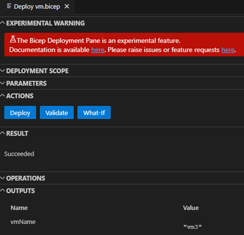 Also available via the menu is the experimental [5] “Bicep Deployment Pane”, which can still show the steps mentioned in a good overview. It also enables a one-click deployment if the appropriate information is configured in the GUI. In addition, output values are directly visible.